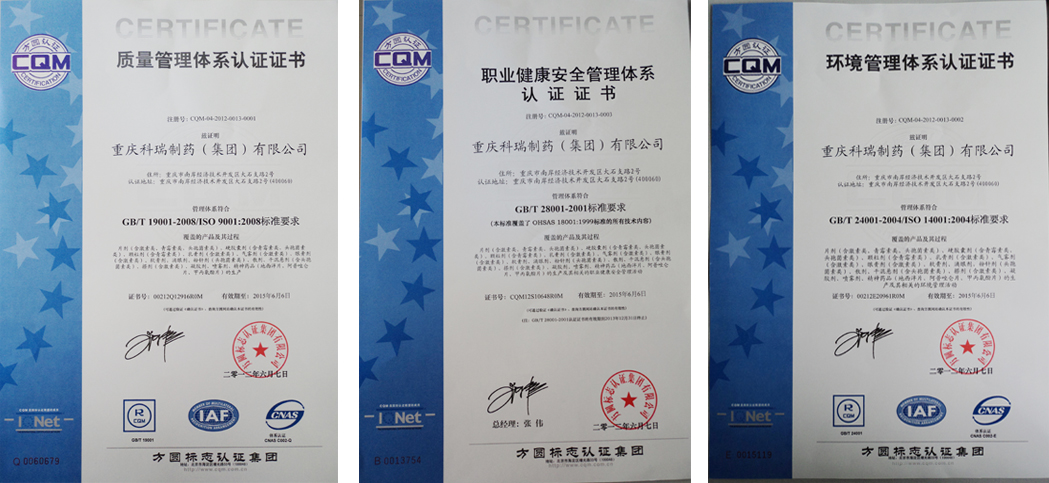 三大国际管理标准的整合认证。多个产品通过美国及欧洲权威机构cGMP认证。