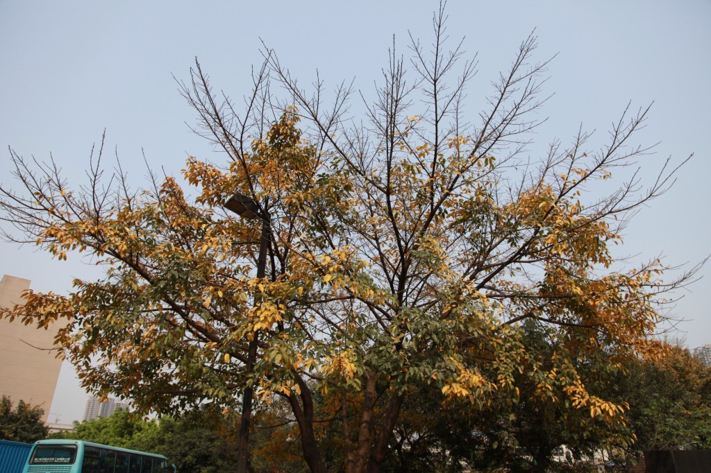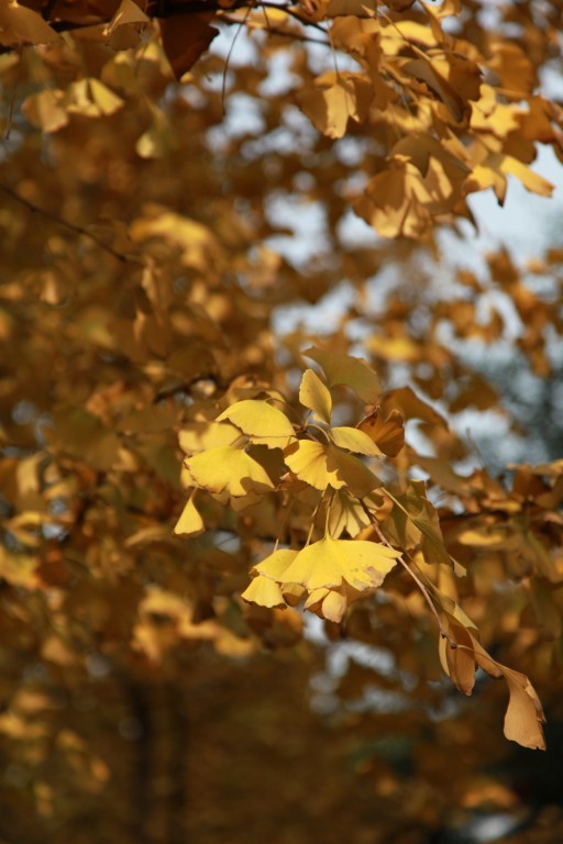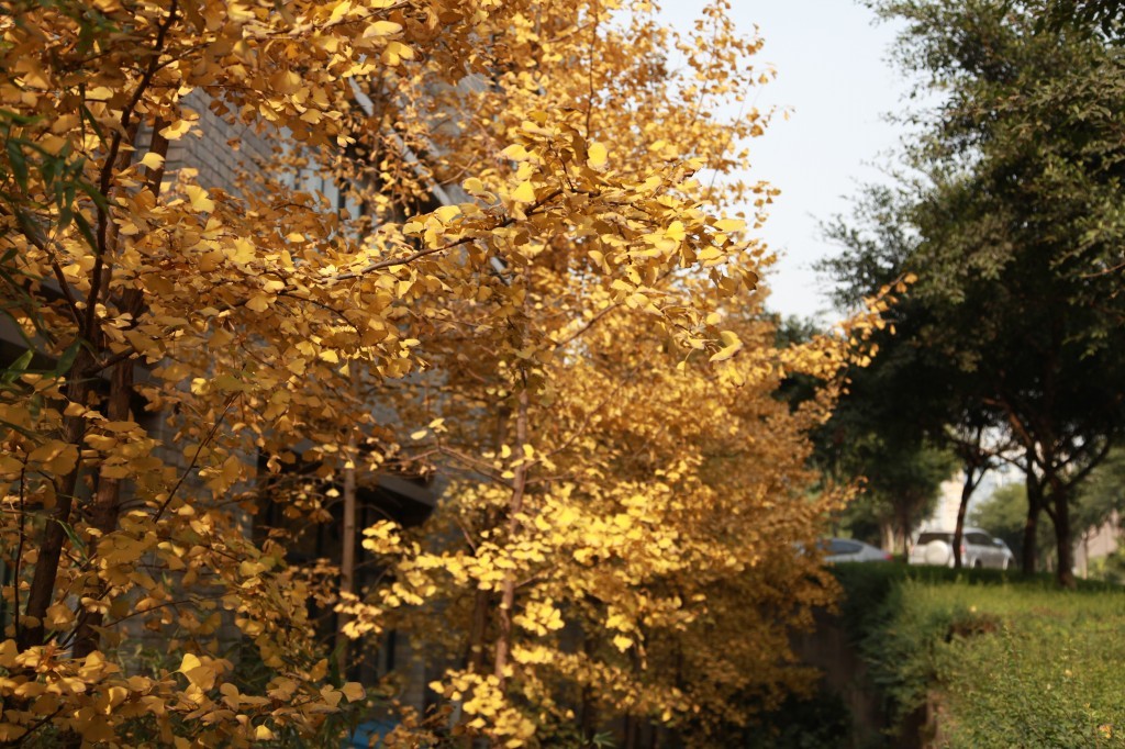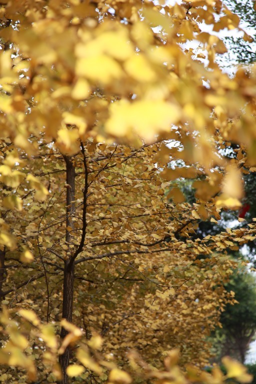 金色的银杏叶是秋天特有的标志,伞形的叶片像一只只蝴蝶栖落在树梢之上。只见银杏在左,榕树在右,一树的金黄代替了艳阳的光彩照出秋日之美,一树的青葱却似乎还在留恋夏日的情怀,一黄一碧,像是两队舞者的舞蹈竞赛,恣意洒脱,却各有风采。