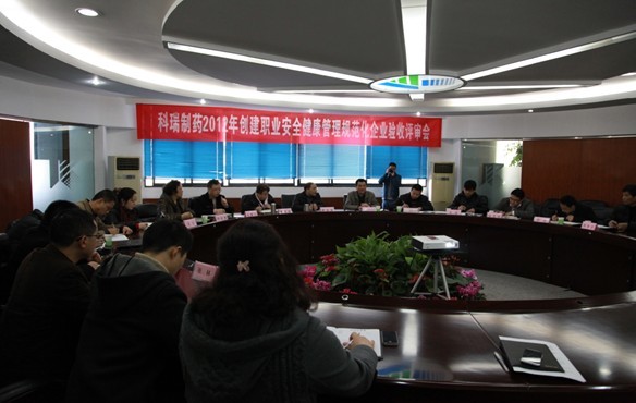 2012年11月26日下午,重庆市安监局杜杜全洪处长,职业健康科杨滔科长、职业卫生健康专家何志军、化医集团安全环保部张忠松等一行4人赴科瑞集团开展了科瑞制药2012年创建职业安全健康管理规范化企业验收评审。评审工作会议由申文求总经理主持,公司相关领导及部门负责人参加了会议。