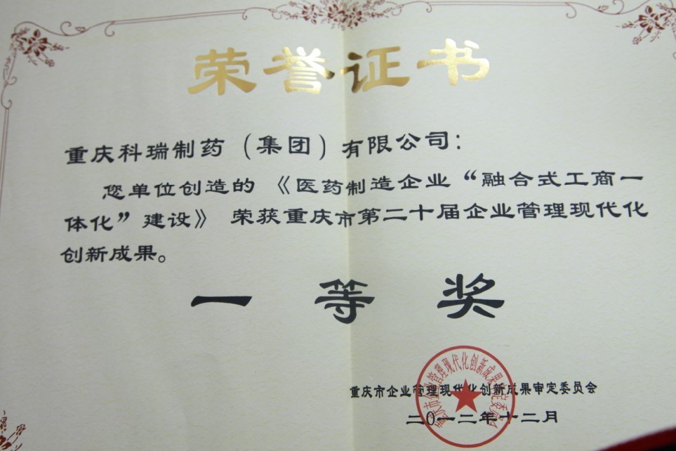 由此,重庆市企业管理现代化创新成果审定委员会专家一致评价,科瑞制药“融合式工商一体化”完全符合企业自身发展需要、也符合行业发展方向,经营成效和社会成效均比较突出,具有较好的复制和推广效应。通过现场答辩等层层选拔,我司《医药制造企业“融合式工商一体化”的建设》在多项企业管理现代化创新成果中脱颖而出,荣获一等奖。