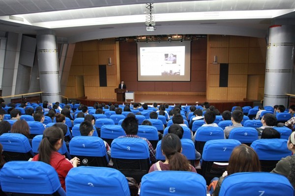 重庆工商大学阶梯教室中“重庆工商大学科瑞制药班”同学们认真听取申文求董事长报告