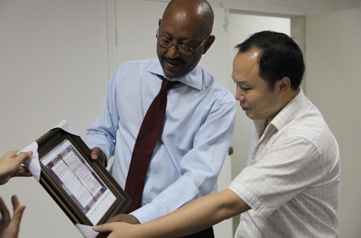 吉尔马.泰莫斯艮总领事向医用设备厂赠送埃赛俄比亚民族特色纪念品