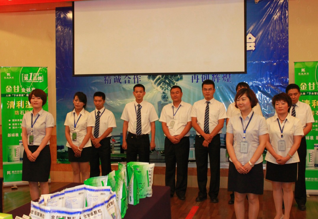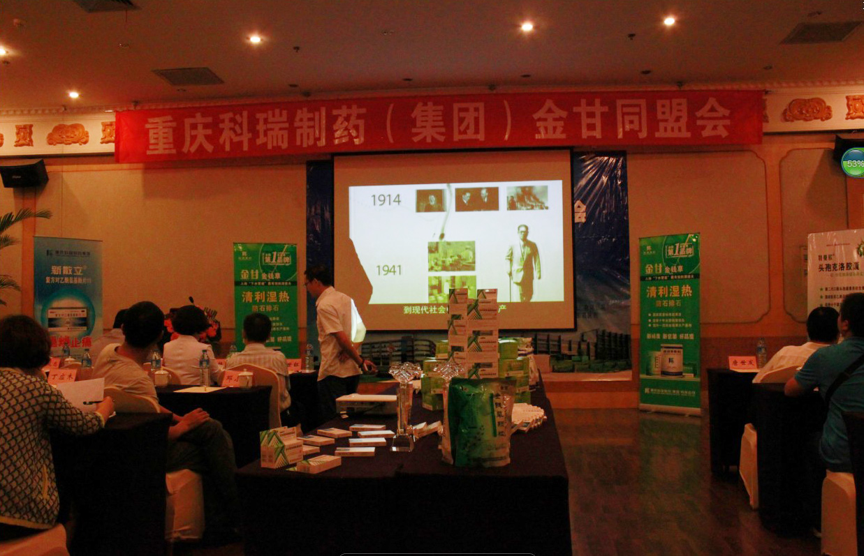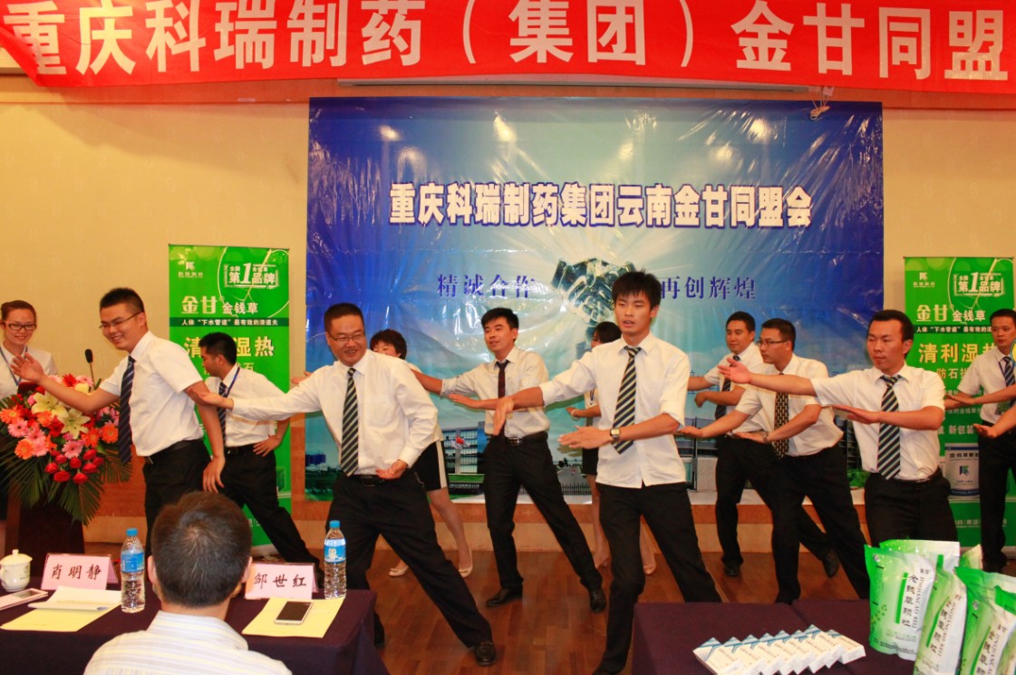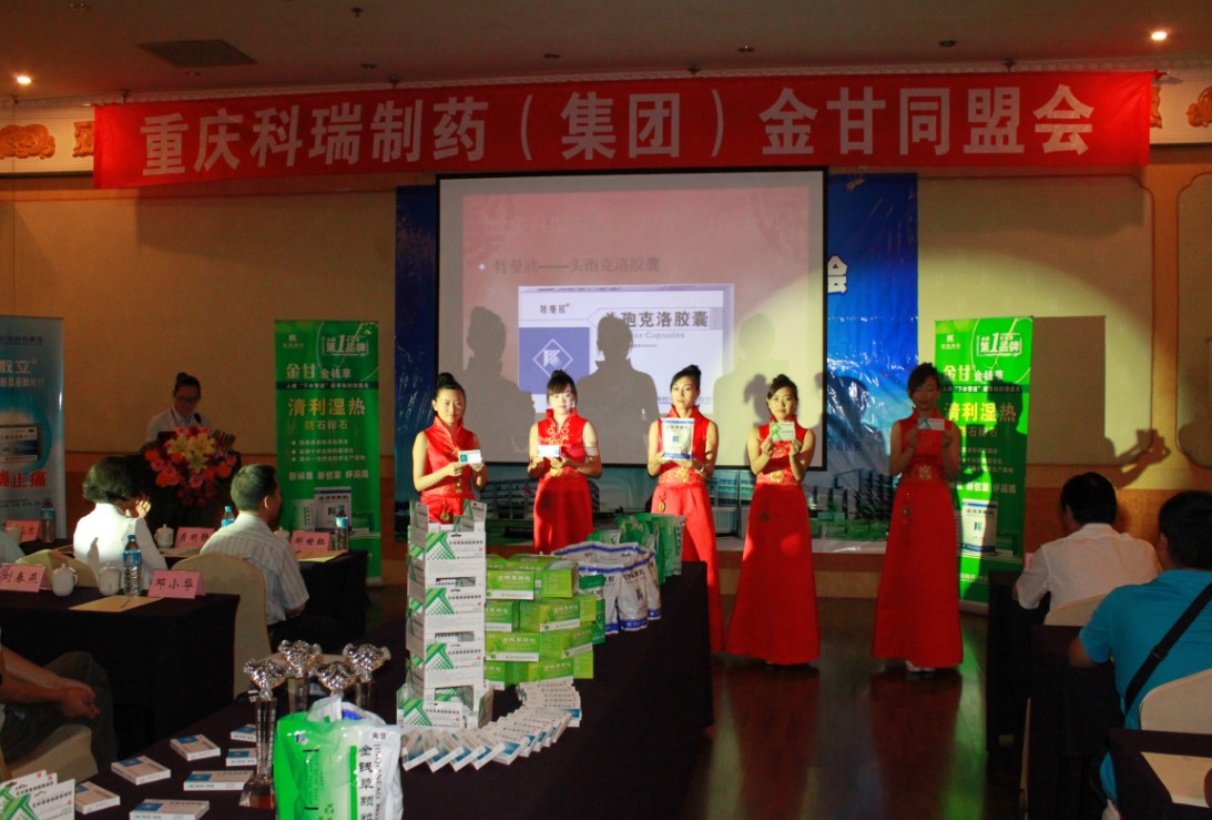 随着轻快舒适的音乐声的响起,五个靓丽优雅的模特手托科瑞的新产品缓缓入场,她们带来了继金甘四个规格以外的“头孢克洛胶囊、新散立、克林霉素霉素磷酸酯、盐酸特比萘芬乳膏”四个新产品。在主持人简短精辟的产品介绍下,新产品瞬间吸引了全场的客户,会场的灯光、手机的闪光交杂在一起,大家议论纷纷,赞赏有加。因为一改以往单调的展台展示,改为模特展示来秀出我们的新产品,表演将会议很快推向第一轮高潮。接着就是订货时间,不到半小时便完成了金钱草9000余件、牙周康200余件的大单。