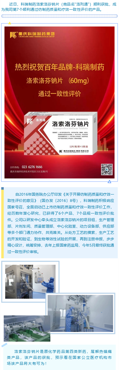 捷报——科瑞制药洛索洛芬钠片通过一致性评价