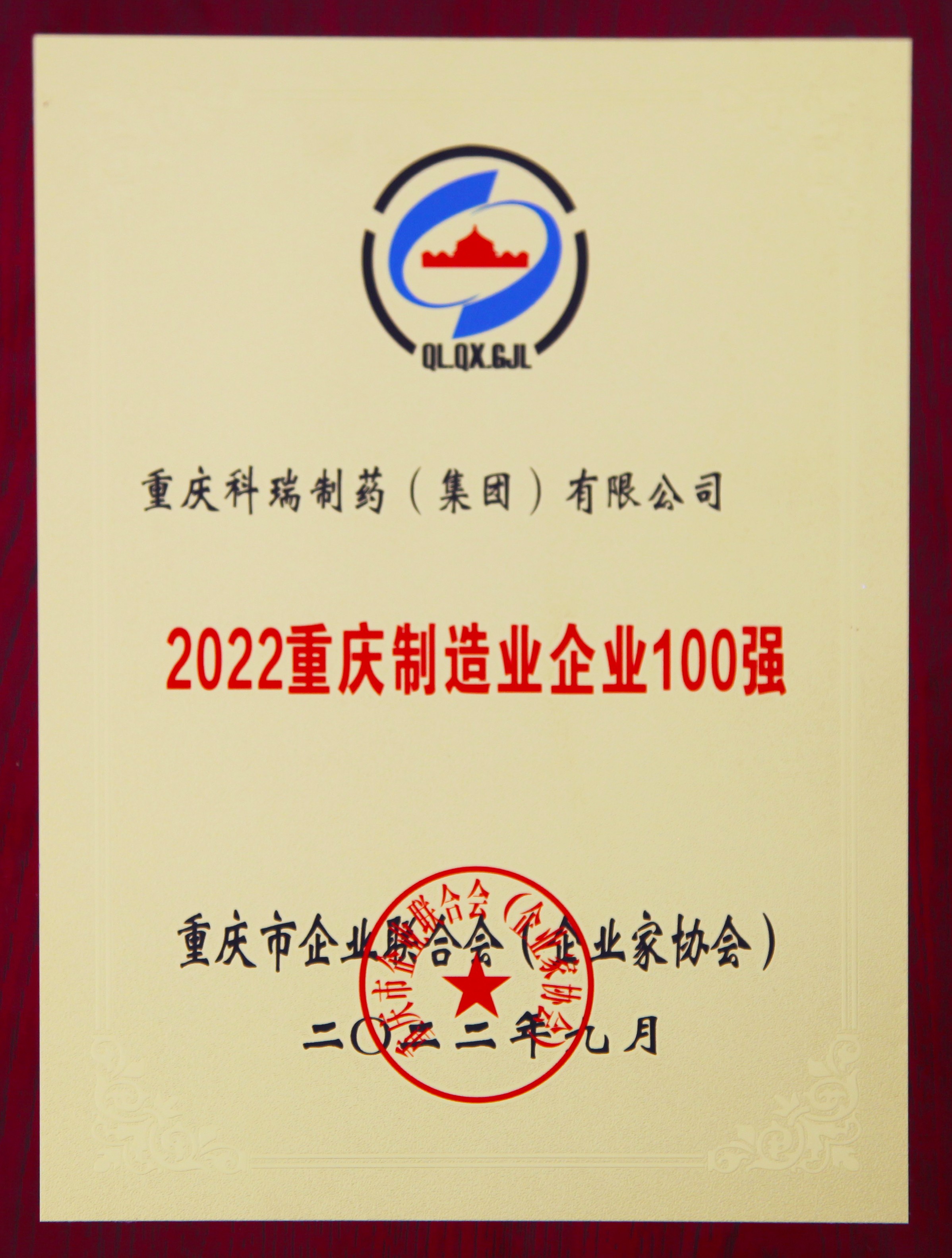 7月8日下午,2022年9月26日,科瑞制药在“2021年度重庆市优秀企业家表彰会暨2022重庆百强企业发布会”上荣膺“2022重庆制造业企业100强”。