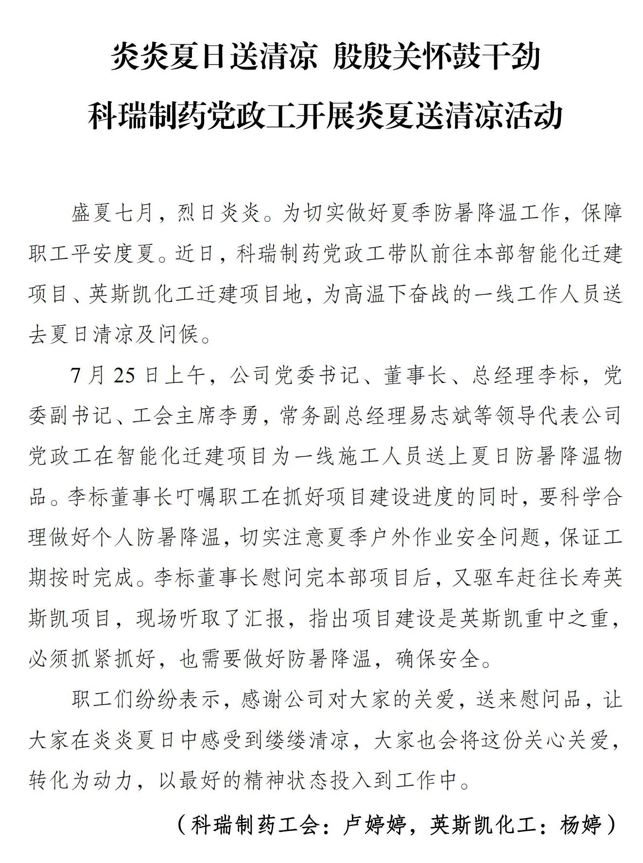 炎炎夏日送清凉 殷殷关怀鼓干劲—科瑞制药党政工开展炎夏送清凉活动