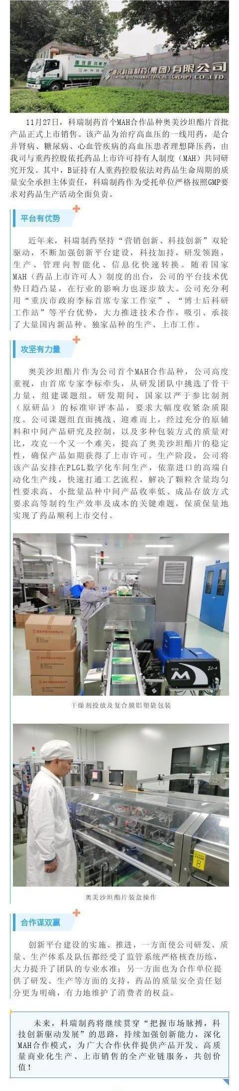 打造一流创新平台 催生MAH快速转化—科瑞制药首个MAH合作品种奥美沙坦酯片上市销售