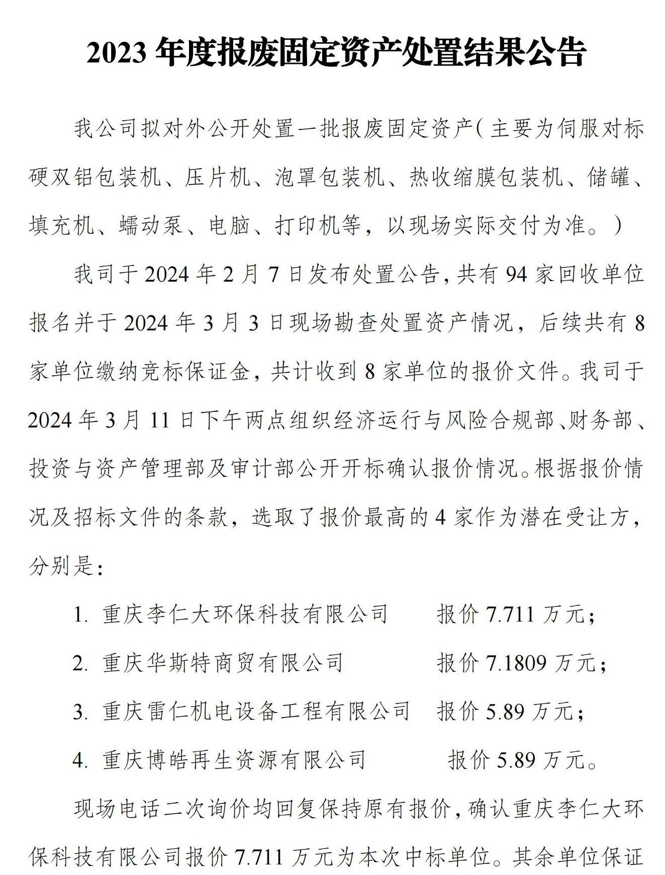 2023年度报废固定资产处置结果公告