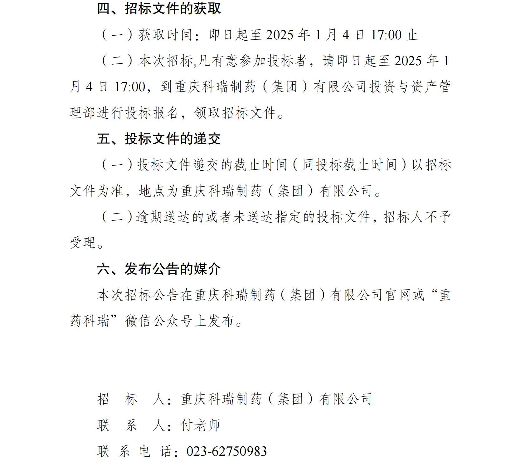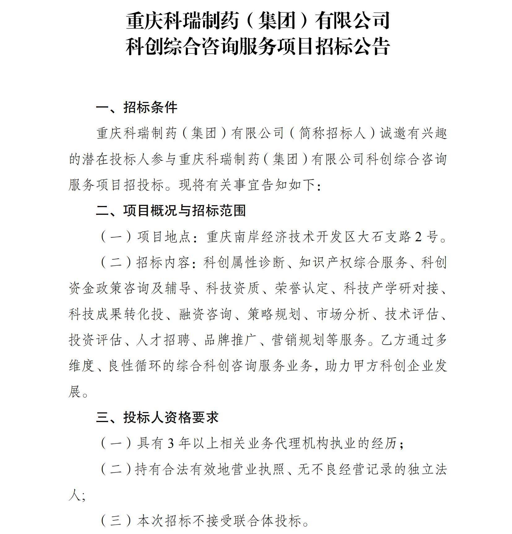重庆科瑞制药(集团)有限公司 科创综合咨询服务项目招标公告